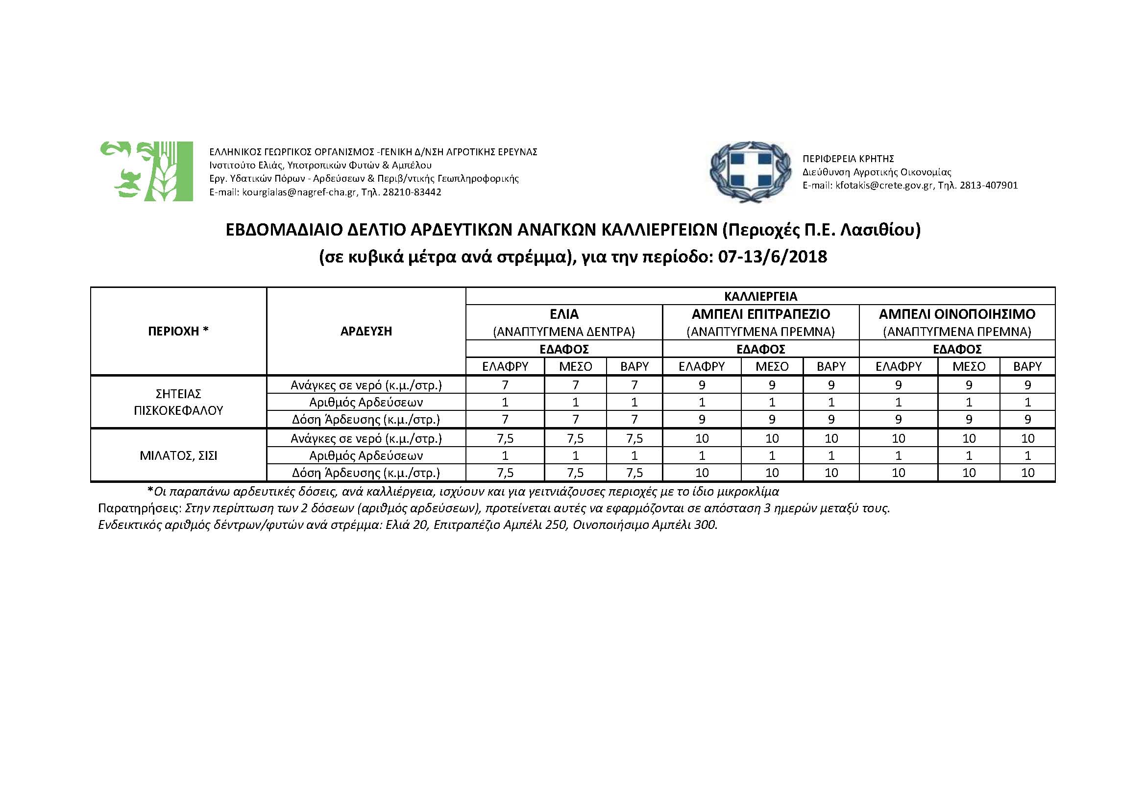 Στα πλαίσια της συνεργασίας του Δήμου Σητείας με τον «ΕΛΛΗΝΙΚΟ ΓΕΩΡΓΙΚΟ ΟΡΓΑΝΙΣΜΟ -ΓΕΝΙΚΗ Δ/ΝΣΗ ΑΓΡΟΤΙΚΗΣ ΕΡΕΥΝΑΣ Ινστιτούτο Ελιάς, Υποτροπικών Φυτών & Αμπέλου Εργ. Υδατικών Πόρων - Αρδεύσεων & Περιβ/ντικής Γεωπληροφορικής» ανακοινώνουμε το ΕΒΔΟΜΑΔΙΑΙΟ ΔΕΛΤΙΟ ΑΡΔΕΥΤΙΚΩΝ ΑΝΑΓΚΩΝ ΚΑΛΛΙΕΡΓΕΙΩΝ (Περιοχές Π.Ε. Λασιθίου) για την περίοδο από 07 - 13/6/2018 που στάλθηκε στο τμήμα Άρδευσης του Δήμου Σητείας και αφορά πιλοτικά την περιοχή Πισκοκεφάλου.