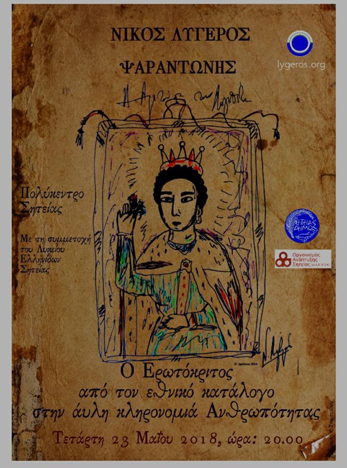 Ημερίδα με θέμα : «ο Ερωτόκριτος από τον εθνικό κατάλογο στην άυλη κληρονομιά της ανθρωπότητας την Τετάρτη 23 Μαΐου 2018 και ώρα 20:00 στο Πολύκεντρο του Δήμου Σητείας.»