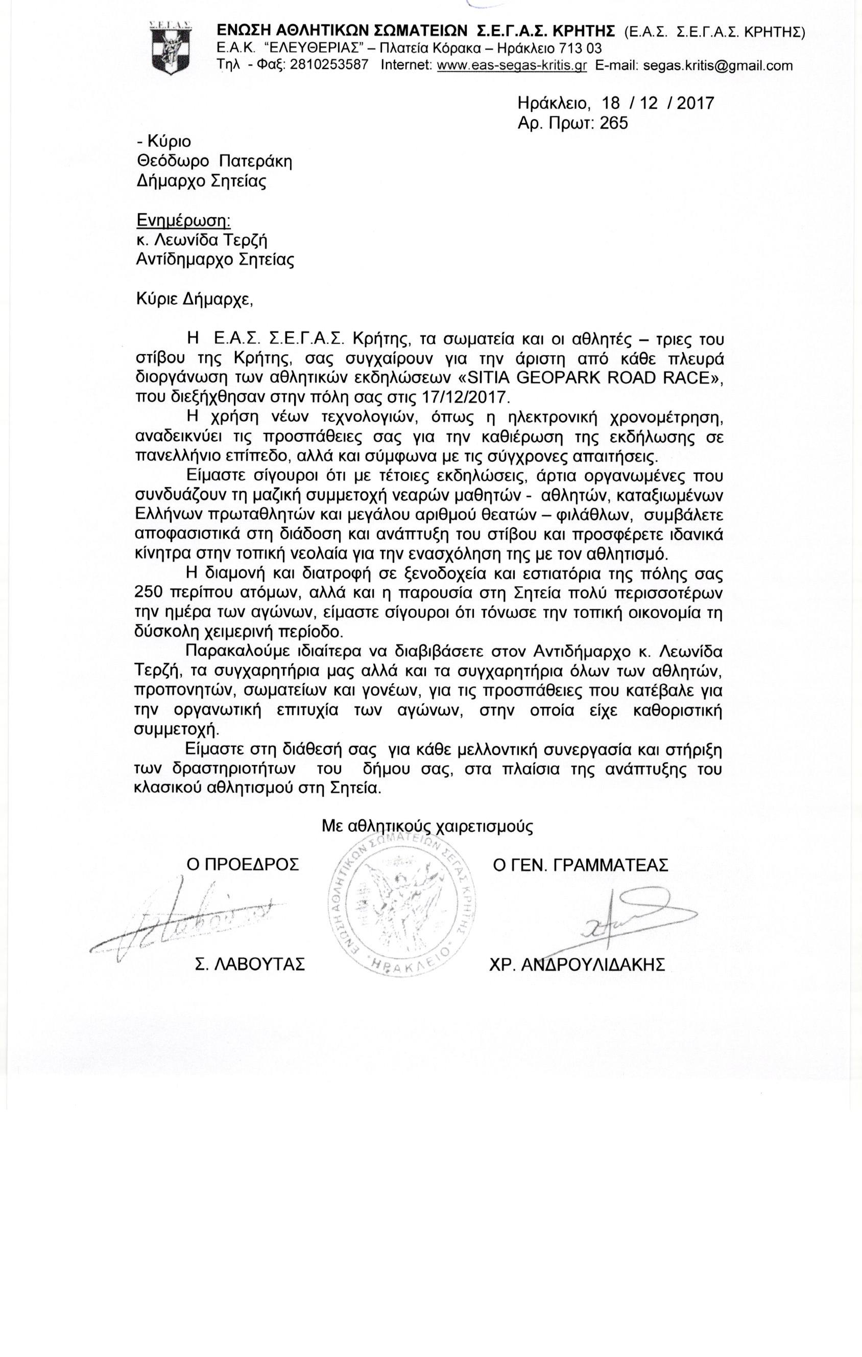 Συγχαρητήρια επιστολή στον Δήμαρχο Σητείας απέστειλε η Ένωση Αθλητικών Σωματείων Σ.Ε.Γ.Α.Σ. Κρήτης για την άριστη από κάθε πλευρά διοργάνωση των αθλητικών εκδηλώσεων “SITIA GEOPARK ROAD RACE” που διεξήχθησαν στη Σητεία στις 17/12/2017.